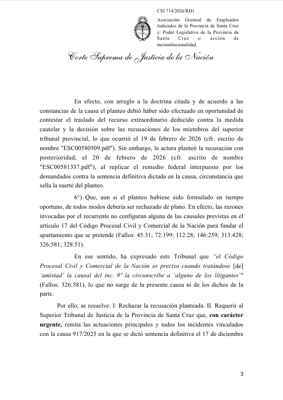 La Corte Suprema de Justicia de la Nación rechazó la recusación presentada por la Asociación Gremial de Empleados Judiciales de Santa Cruz en el marco de la causa por la ampliación del Tribunal Superior de Justicia provincial. El máximo órgano judicial consideró el planteo inadmisible por extemporáneo y sin fundamentos válidos, al haberse presentado fuera del momento procesal correspondiente y sin encuadrar en las causales previstas por el Código Procesal Civil y Comercial de la Nación.